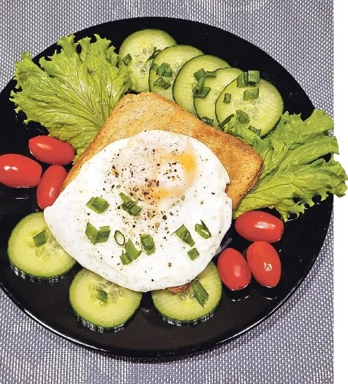 Tikmēr jau pannā izkausēju atlikušo sviestu, akurāti iesitu olas un izcepu vēršacis. Uzkaisīju sāli un maltus piparus. Tad olas uzliku uz pildītajām maizītēm un papildināju maltīti ar svaigiem salātiem.