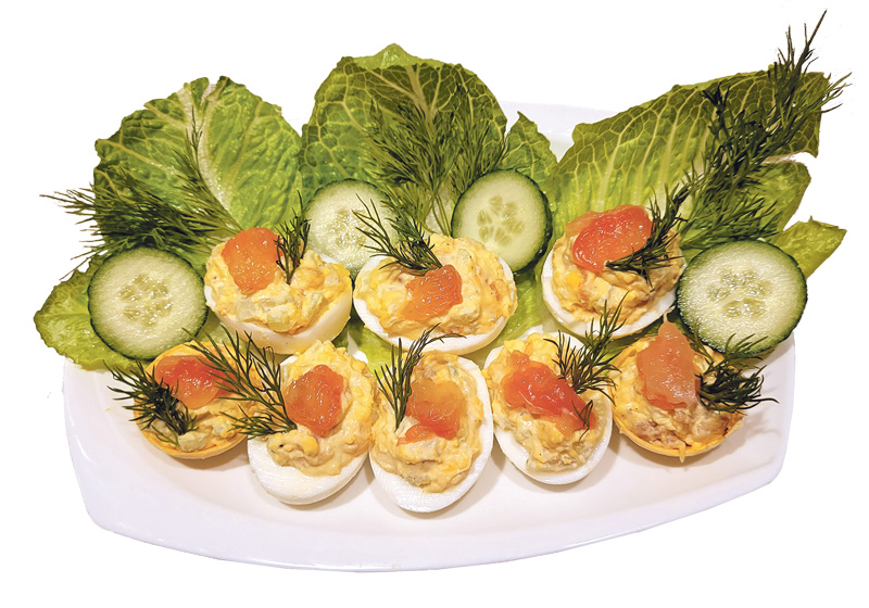 Vārītās olas nolobīju, pārgriezu uz pusēm un izņēmu dzeltenumus. Tos ar dakšiņu labi sasmalcināju. Gurķus un kūpināta laša gabaliņus sīki sagriezu, pievienoju olu dzeltenumiem, piekaisīju piparus un piemaisīju biezu majonēzi. Ar pagatavoto masu piepildīju olu baltumu pusītes, ko rotāju ar greipfrūta gabaliņiem un zaļumiem.