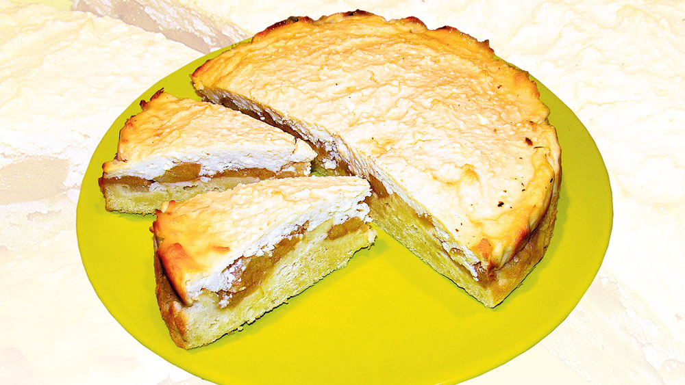 Nelielajā veidnē ieklāju cepamo papīru, to mazliet ietaukoju ar augu eļļu, tad izlīdzināju mīklu, virs tās vienmērīgi izkārtoju ābolus un pārklāju ar biezpiena masu. Cepu līdz 180 grādiem uzkarsētā cepeškrāsnī (bez konvekcijas) apmēram 35 minūtes. Atdzisušu gatavo pīrāgu pēc vēlēšanās vēl varam pārkaisīt ar pūdercukuru.