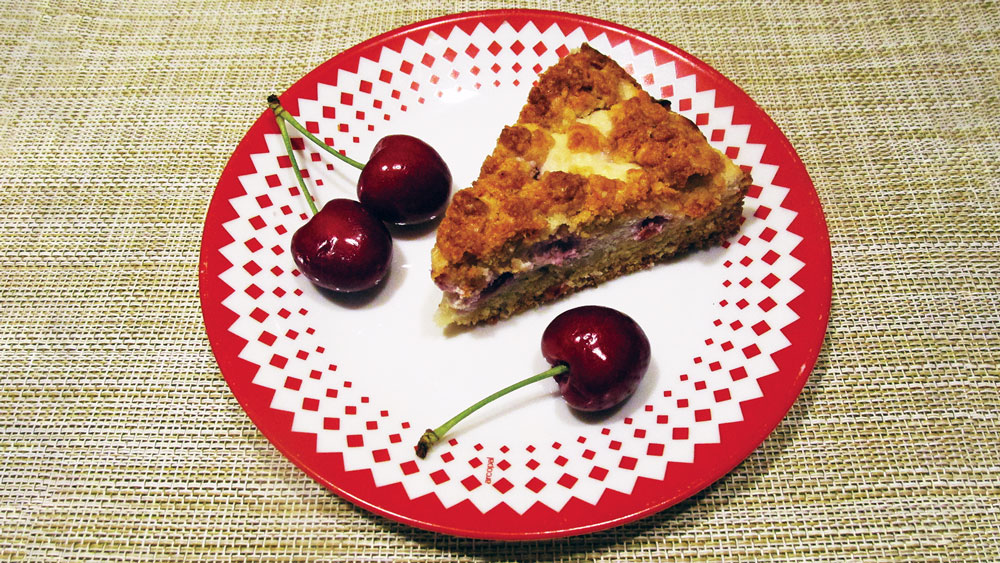 Lai izceptu šo gardo pīrāgu, šoreiz iegādājos saldos ķiršus. Tas ir pietiekami liels, un tā pietiks vairākiem ēdājiem. Dziļajā bļodā samaisīju miltus ar cukuru. Pievienoju olu, ar etiķi dzēstu sodu un gabaliņos sagrieztu aukstu sviestu. Saberzu drupatās, pieliku skābo krējumu un samīcīju mīklu. Sadalīju to divās daļās – 2/3 un 1/3. Tās ietinu pārtikas plēvītē un lielāko uz 30 minūtēm ievietoju ledusskapī, bet mazāko – saldētavā.