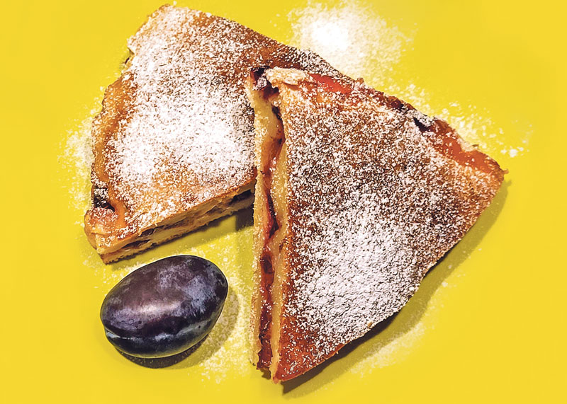 Daļu mīklas izlīdzināju ar cepamo papīru izklātā 26 centimetru diametra veidnē ar noņemamo apmali, pāri – plūmju pildījumu, ko nosedzu ar atlikušo mīklu. Virspusi pārsmērēju ar sakulto olu un liku veidni līdz 180 grādiem uzkarsētā cepeškrāsnī. Pīrāgu cepu 45–50 minūtes.