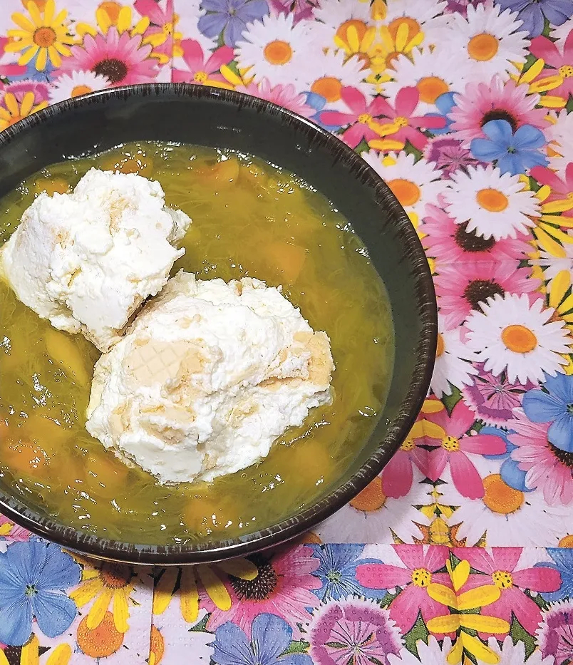 Tad krējumā iemaisīju vafeļu gabaliņus un izšķīdināto želatīnu. Ievietoju krēmu ledusskapī sastingšanai. Šādu gardumu varam celt galdā arī ar kādu ogu mērci, piemēram, aveņu vai zemeņu.