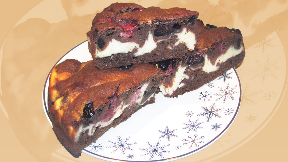 Veidni izklāju ar cepamo papīru, vēl mazliet ietaukoju ar sviestu un izliku tajā apmēram 2/3 šokolādes mīklas. Virsū izlīdzināju gaišo biezpiena siera mīklu. Pēc tam piciņām liku tai pāri atlikušo šokolādes mīklu un visu ar koka irbulīti vēl nedaudz pajaucu, lai iegūtu raibāku kūku. Visbeidzot, tās mazliet iespiežot mīklā, izkārtoju ogas – šoreiz izmantoju saldētās zemenes un svaigas lielogu mellenes. Liku cepties līdz 180 grādiem uzkarsētā cepeškrāsnī vismaz pusstundu. Gatavo kūku atdzesēju un sagriezu gabaliņos.