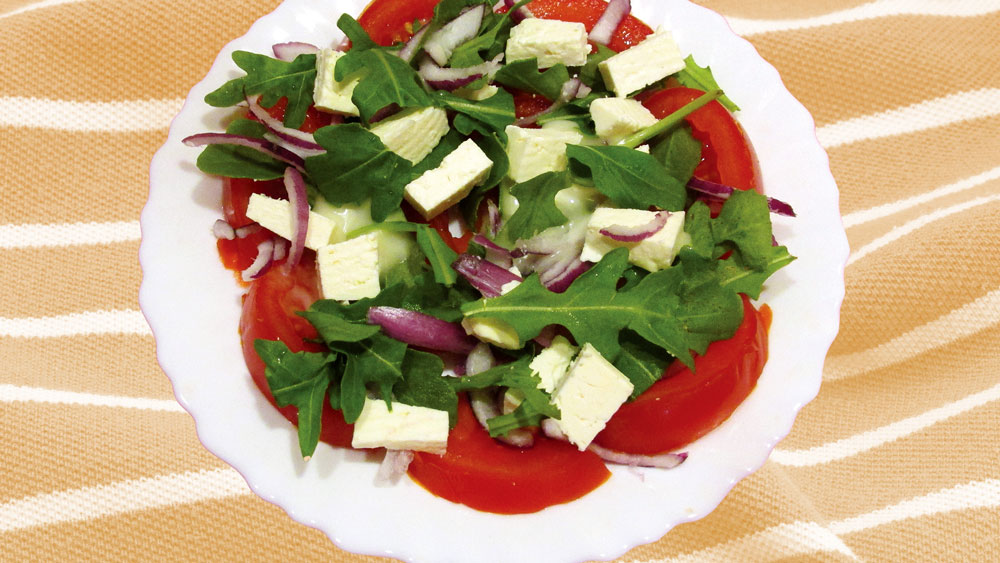 Nu jau esmu iemācījusies dažādu salātu pagatavošanai izmantot arī rukolu ar mazliet īpatnējo tās garšu. Tomātus un rukolu nomazgāju un apsusināju. Tomātus, fetu (var būt arī brinza) un sīpolu sagriezu – sastāvdaļu daudzums pēc vajadzības. Visu sagatavoto izkārtoju uz šķīvja un pārlēju ar balzametiķa mērci.