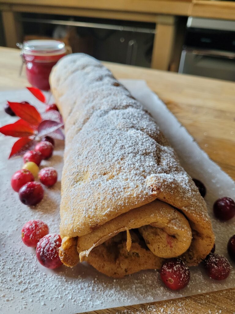 Olu baltumus atdala no dzeltenumiem. Olu dzeltenumiem pievieno četras ēdamkarotes cukura un vaniļas cukuru, saputo, līdz masa kļuvusi gaiša un palielinājusies apjomā. Olu baltumus ar sāli saputo stingrās putās. Miltus samaisa ar cepamo pulveri. Olu dzeltenumu masai pievieno aptuveni trešdaļu no olu baltumiem, iecilā, strauji nemaisot, pakāpeniski iemaisa miltu un cepampulvera maisījumu, noslēgumā iecilā atlikušo olu baltumu. Masu lej uz āboliem un dzērvenēm. Izlīdzina tā, lai nosedz visu. Cep cepeškrāsnī 15-20 minūtes. Kad biskvīts kļuvis zeltaini brūns, pannu apklāj ar tīru dvielīti vai cepampapīra loksni un apgriež otrādi tā, lai āboli virspusē. Satin ruletē. Pēc brītiņa, ja vēlas, apkaisa ar pūdercukuru un sagriež šķēlītēs.