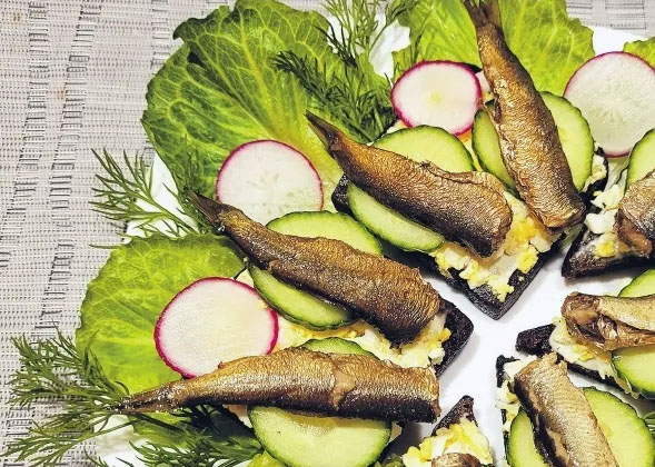 Katru maizes gabaliņu vispirms pārsmērēju ar kausēto sieru, tad pārkaisīju ar sarīvētajām olām un pārliku ar svaiga gurķa ripiņu. Katrai vēl uzliku pa šprotei, izkārtoju uz lēzenā šķīvja, rotājumam izmantojot lapu salātus, diļļu zaļumus un redīsus. Ēdiena paspilgtināšanai noderēs arī krāsaini ķiršu tomātiņi.