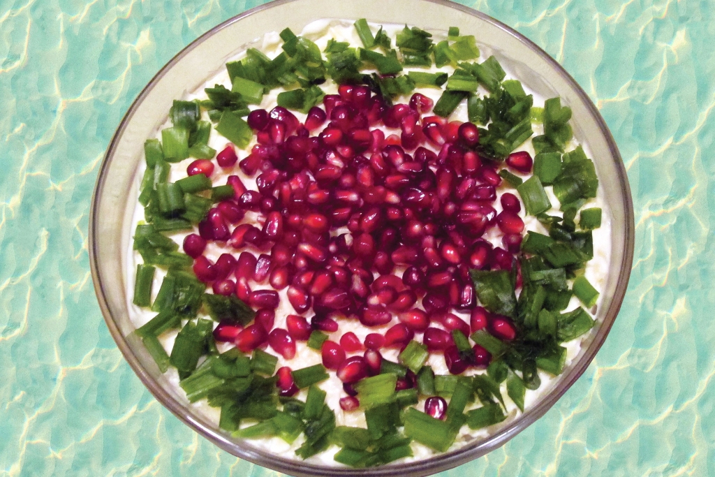 Salāti ar granātābolu sēkliņām un kūpinātu cāļa šķiņķīti