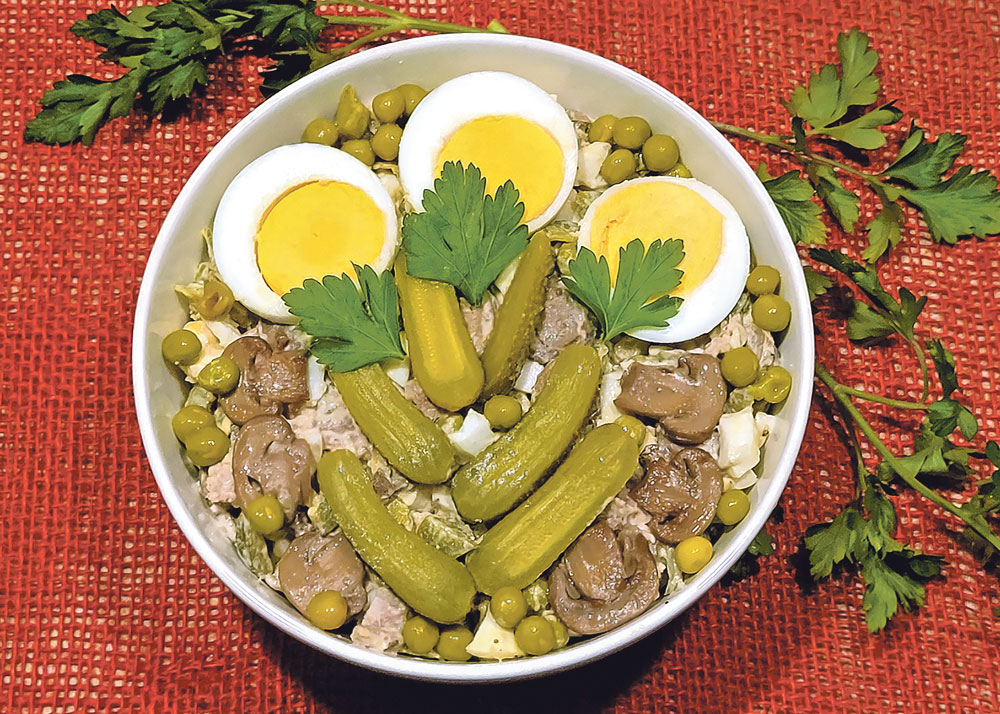 Bļodā samaisīju visas sagatavotās salātu sastāvdaļas ar majonēzi, pēc garšas piekaisot sāli un piparus. Salātus rotāju ar to sastāvā ietilpstošajām izejvielām un pētersīļu lapiņām. Ļoti gardi!