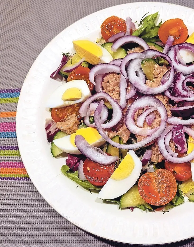 Uz šķīvja izkārtoju saplucinātas dažādu salātu lapas. Gurķi sagriezu gabaliņos un pārbēru pāri, pārkaisīju arī sasmalcinātas dillītes. Ķirštomātiņus pārgriezu uz pusēm, olas nolobīju un sagriezu daiviņās. Arī šīs sastāvdaļas izkārtoju uz šķīvja. Visu pārslacīju ar olīveļļu un balzamiko etiķi. Sāli pat nepievienoju.