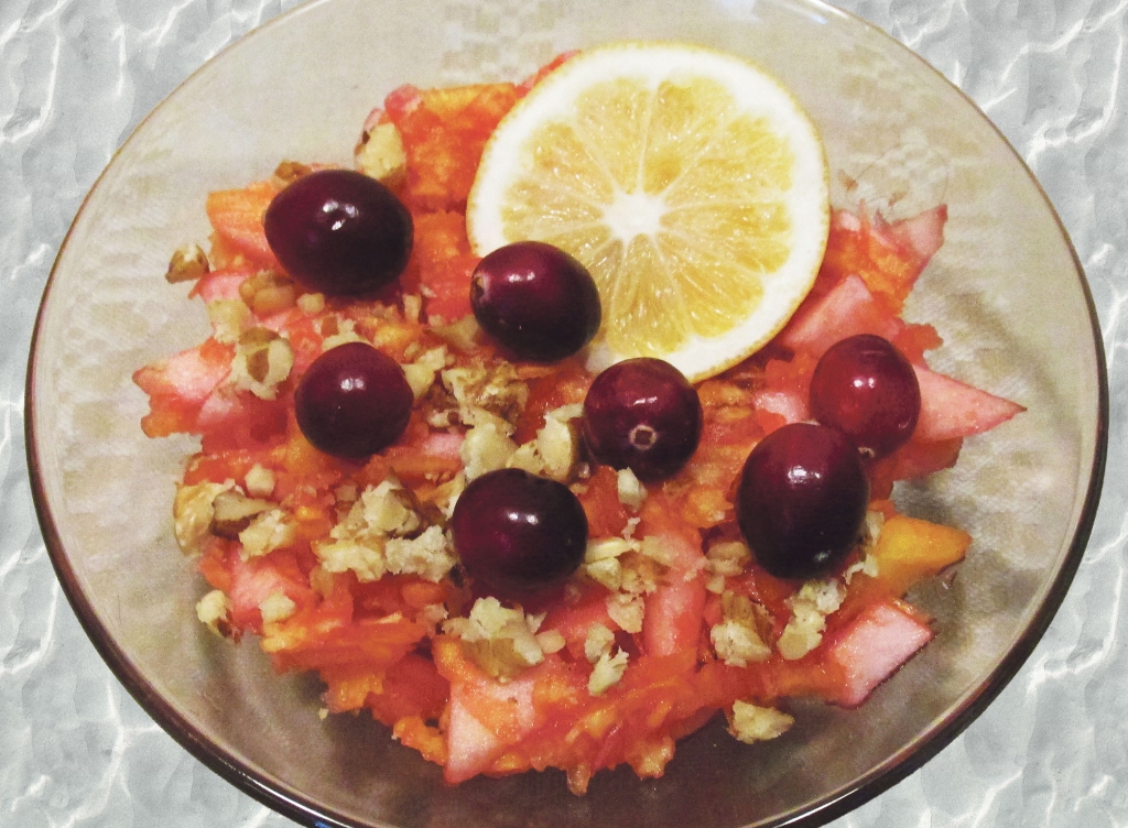 Ķirbja mīkstumu sarīvēju uz vidēji rupjas rīves. Ābolu nomizoju un sagriezu salmiņos. Pielēju svaigu dzērveņu sulu, pievienoju citrona miziņu un piemaisīju medu (te varam izlīdzēties arī ar cukuru). Saldskābo veselīgo maisījumu liku saldēdiena trauciņos, pārkaisīju ar sadrupinātiem valriekstu kodoliem un rotāju ar svaigām dzērvenēm. Garšoja atsvaidzinoši, un ķirbja garša pat nebija jūtama.