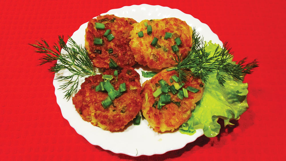 Miltu maisījumā ielēju pienu ar olu un ar putojamo slotiņu labi samaisīju, lai nav kunkuļu. Pievienoju sieru, gaļu un sīpolus un visu atkal sajaucu. Uzkarsēju pannu ar 2 – 3 ēdamkarotēm augu eļļas un ar karoti liku tajā pagatavoto masu, veidojot pankūkas. Cepu tās no abām pusēm, līdz veidojās zeltaina garoziņa un tās bija gatavas. Eļļu pannā pielēju pēc vajadzības, līdz visas pankūkas bija izceptas. Tad tās karstas varam celt galdā kopā ar skābo krējumu, pārkaisītas ar lociņiem.