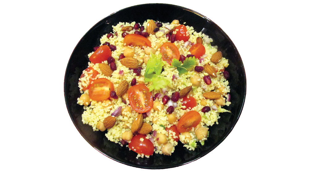 Sagatavoto kuskusu pārbēru bļodā, pievienoju zirņus, sīpolus, tomātiņus, kā arī zaļumus, mandeles un granātābolu sēkliņas. Visu samaisīju un izliku salāttraukā.