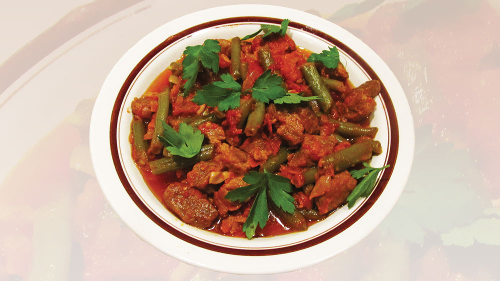 Sīpolus sagriezu nelielos kubiņos, ķiplokus sasmalcināju spiedē un apcepu augu eļļā. Pievienoju notīrītu un uz rupjās rīves sarīvētu burkānu. Visu cepu vairākas minūtes. Tad te varētu pievienot sagrieztu jēlu gaļu, taču izvēlējos to sagatavot atsevišķi un tad pievienot dārzeņiem pannā. Visu apmaisot pacepu vēl dažas minūtes. Pēc tam piekaisīju sāli, piparus un cukuru, pievienoju savā sulā konservētus gabaliņos sagrieztus tomātus, kā arī sagrieztas saldētās pupiņu pākstis. Nu visu kopā sautēju zem vāka, līdz pupiņas mīkstas.