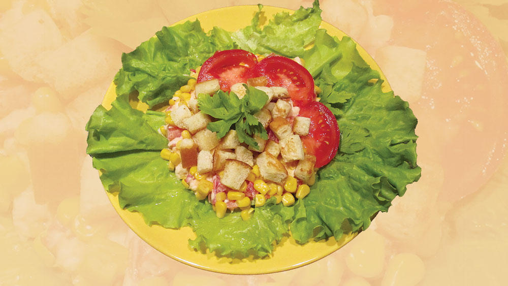 Maizīti – te, pēc savas izvēles un garšas izjūtām, varam izmantot gan baltmaizi, gan arī rupjmaizi – sagriezu kubiņos un uz pannas pavisam nelielā daudzumā augu eļļas apcepu, lai grauzdiņi būtu kraukšķīgi. Tomātus sagriezu nelielos gabaliņos, sieru sarīvēju uz rupjās rīves, bet ķiplokus – ja salātus vēlamies pikantākus, tos varam ņemt vairāk – sasmalcināju spiedē. Šīs sastāvdaļas savienoju, pieliku notecinātu konservēto kukurūzu, sāli un piparus pēc garšas un majonēzi. Visu labi sajaucu. Šķīvi izklāju ar lapu salātiem un virs tiem izliku pagatavoto pikanto siera un tomātu maisījumu, ko visbeidzot bagātīgi pārkaisīju ar grauzdiņiem.