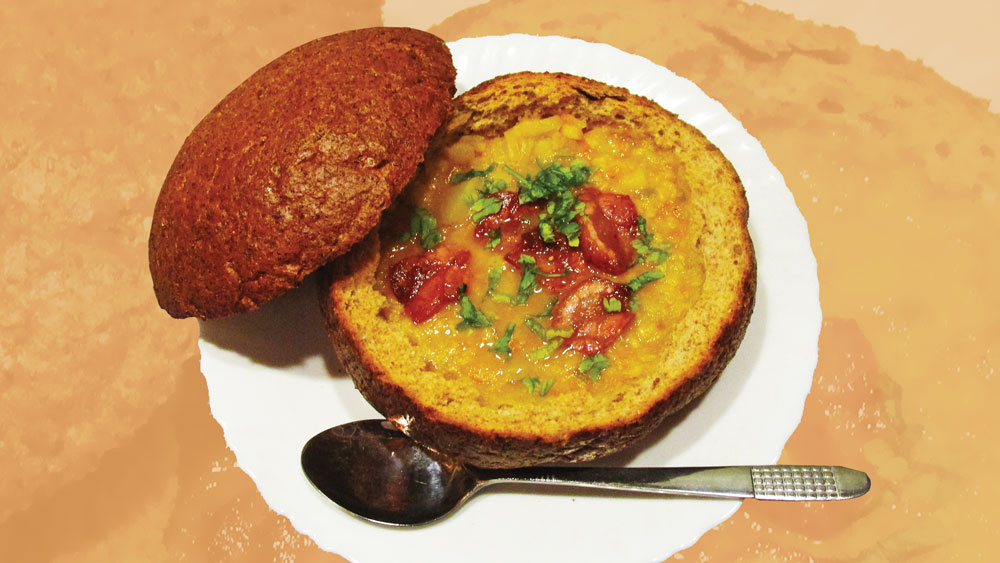 Šķelto zirņu zupa maizes “bļodiņā”