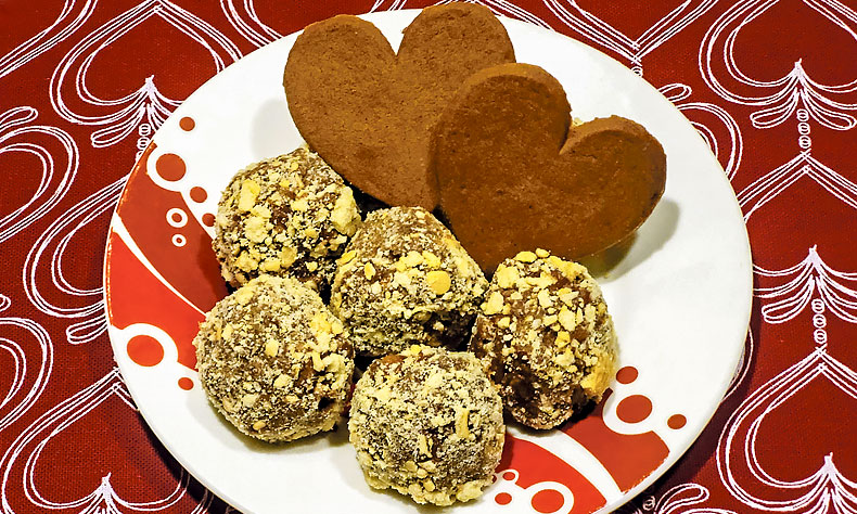 Tā kā zemesriekstu sviestu izmantoju ar riekstu gabaliņiem, saldās bumbiņas izdevās bagātīgākas. Ja tās vēlamies vēl stingrākas, masai varam pievienot arī mazliet sasmalcinātu cepumu, līdzīgi kā saldajai desai. Trifeles varam arī iemērcēt izkausētā tumšajā šokolādē un apviļāt sasmalcinātos sālītos grauzdētos zemesriekstos, tādējādi dažādojot to garšu.