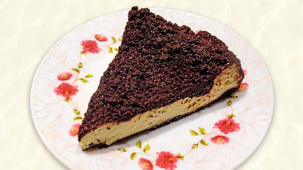 Tad pagatavoju biezpiena pildījumu. Šim nolūkam viendabīgā masā sakūlu kopā biezpienu, cukuru, olas, skābo krējumu un kukurūzas cieti. Pildījumu vienmērīgi izlīdzināju virs šokolādes pamatnes un pārklāju ar atlikušo pusi brūno drupatu. Cepu pīrāgu līdz 180 grādiem uzkarsētā cepeškrāsnī apmēram 45 minūtes, pēc tam pilnībā atdzesēju. Tikai tad to sagriezu gabaliņos.
