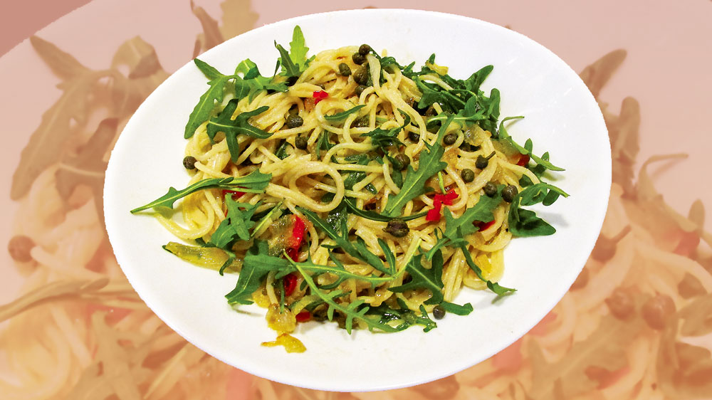 Izvārītos makaronus sajaucu ar pannas saturu, rukolu, pielēju pavisam nedaudz šķidruma, kurā bija vārījušies makaroni, piekaisīju piparus un sāli, pievienoju arī konservētos kaperus. Ēdienu vēl samaisīju un karstu izliku uz šķīvjiem.