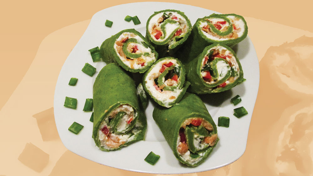 Bļodā ielēju pienu, pievienoju spinātu biezeni, piemaisīju olas, cukuru un sāli. Pakāpeniski piesijājot miltus, ar putojamo slotiņu sakūlu viendabīgu masu. Visbeidzot iemaisīju arī augu eļļu un vārītu ūdeni. Atstāju zaļo mīklu nedaudz uzbriest, pēc tam karstā ar augu eļļu ietaukotā pannā no abām pusēm izcepu pankūkas. Tās, lai neapkalstu, tinot būtu elastīgas un nelūztu, liku uz lēzenā šķīvja citu virs citas un minūtes desmit pēc izcepšanas vēl paturēju, pārsegtas ar pārtikas plēvīti. Tad pa vienai pankūkas pārklāju ar svaigo sieru “Philadelphia”, izkārtoju pāri arī mazsālīta laša gabaliņus, smalkās strēmelītēs sagrieztu sarkano saldo piparu un sasmalcinātus sīpolu lociņus. Tās satinu ruletēs un pēc tam ar asu nazi sagriezu. Liec kaut vai svētku galdā!