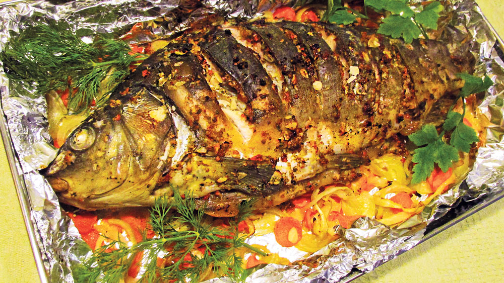 Karpu izķidāju, galvu atstājot. Asti gan dabūju nogriezt, jo tik lielas pannas, lai zivs tur satilptu visā garumā, nebija. Karpu labi nomazgāju, apsusināju un no abām pusēm ar asu nazi virspusē vairākās vietās iegriezu. Tad ierīvēju ar sāli un pipariem, pārslacīju ar citrona sulu un atstāju vismaz desmit minūtes ievilkties. Mandeļu skaidiņas sasmalcināju un samaisīju ar pārpalikušo citrona sulu un olīveļļu (to gan nedaudz atstāju arī dārzeņiem), pievienoju kaltētās garšvielas zivju ēdieniem un samaisīju putriņā. Ar šo maisījumu ierīvēju karpu gan no iekšpuses, gan ārpuses, arī iegriezumus.