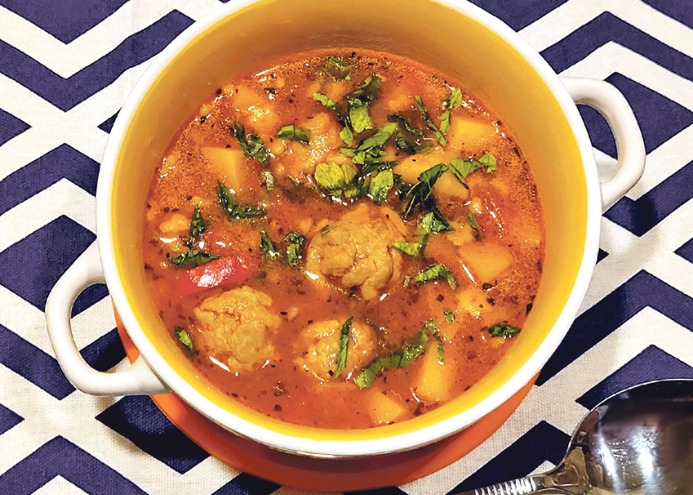 Sīpolus nomizoju un sasmalcināju. Sarkano saldo piparu iztīrīju no sēkliņām un sagriezu strēmelītēs. Kartupeļus nomizoju un sagriezu kubiņos. No tītara maltās gaļas, kas nu jau ir pieejama arī mūsu veikalos, izveidoju nelielas bumbiņas.
