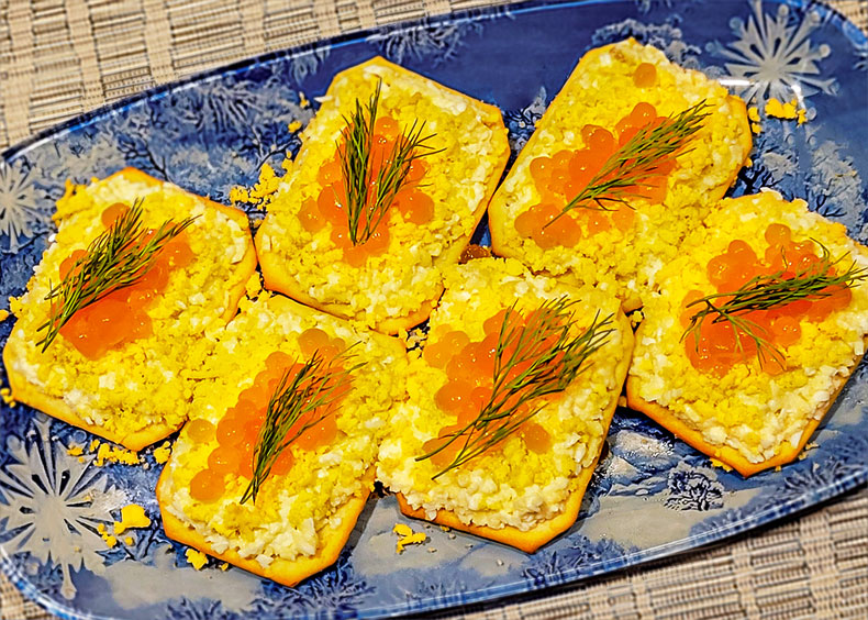 OLAS IZVĀRĪJU, atdzesēju aukstā ūdenī un pēc tam nolobīju. Atdalīju baltumus no dzeltenumiem un tos atsevišķi sarīvēju uz smalkās rīves. Smalki sarīvēju arī sieru, cik šķita nepieciešams izvēlētā krekeru daudzuma sagatavošanai. Ķiplokus sasmalcināju spiedē un pievienoju sieram, pieliku arī sarīvētos olu baltumus. Masai piejaucu biezu majonēzi, raugoties gan, lai netiek par šķidru. Pēc tam ar šo maisījumu no vienas puses pārsmērēju krekerus un izkārtoju uz lēzenā šķīvja. Virspusi tiem vēl pārkaisīju ar sarīvētajiem olu dzeltenumiem. Uzkodas rotāju ar ikriem – te varam izmantot arī iecienītos sviestmaižu ikrus, grezni un pietiekami gardi būs tāpat. Kādu diļļu zaļumiņu arī vēl varam uzlikt.