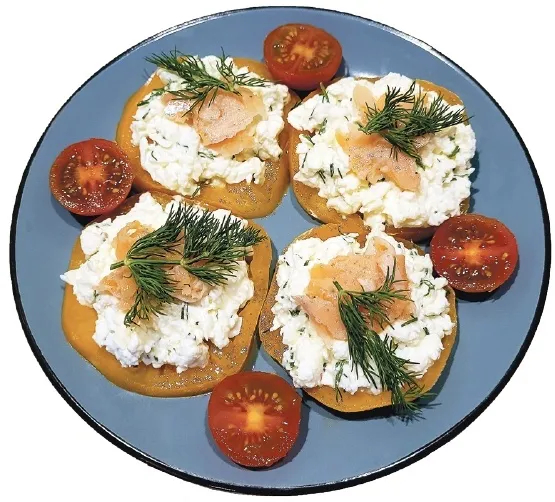 Tomātu, šoreiz biju iegādājusies dzelteno, nomazgāju, apsusināju un sagriezu apmēram puscentimetru biezās ripiņās. Tās pārklāju ar sagatavoto siera masu un katrai uzkodai vēl uzliku pa mazsālīta laša gabaliņam. Lieliski te noderēs garneles.