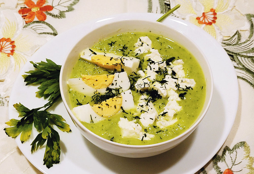 Gurķi, kātu selerijas un avokado nomazgāju. Avokado nomizoju un izņēmu kauliņu. Dārzeņus sagriezu gabalos un liku blendera krūzē, turpat – arī sarīvētu ingvera sakni, pētersīļu zaļumus, olīveļļu un citrona sulu. Garšai pievienoju arī ķiploka daiviņu un sāli. Visu ar rokas blendera palīdzību sasmalcināju. Zupu līdz vēlamajai konsistencei atšķaidīju ar aukstu novārītu ūdeni, lēju bļodiņās un papildināju ar vārītu olu, fetas sieru un pārkaisīju ar sasmalcinātiem diļļu zaļumiem.