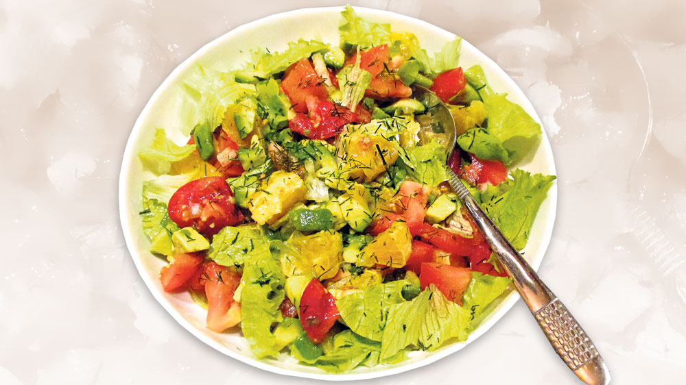 Apelsīnu un avokado nomizoju un sagriezu nelielos gabaliņos, avokado mīkstumu vēl pārslacīju ar citrona sulu, lai nebrūnē. Lapu salātus noskaloju, apsusināju un saplucināju, dilles sasmalcināju. Tomātus sagriezu palielos gabaliņos, bet nomizotu sīpolu — sīki.