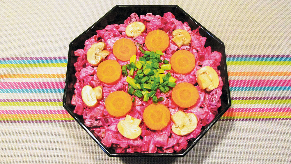 Bietes biju iegādājusies jau izvārītas, tās sagriezu kubiņos. Atsevišķi izvārīju kartupeļus un burkānus, tos atdzesēju, nomizoju un sagriezu kubiņos. Sagriezu arī gurķus. Nomizoju un sasmalcināju pāris sarkanos sīpolus. Šampinjoni burciņā jau bija sagriezti. Sarkanajām pupiņām nolēju šķidrumu un tās noskaloju. Nu atlika tikai sajaukt visas sagatavotās sastāvdaļas lielā bļodā. Mērcei majonēzi samaisīju ar sinepēm un rūpīgi piejaucu dārzeņiem ar pupiņām un sēnēm, piekaisot garšai arī sāli un piparus. Pārliku vinegretu salātu traukā un rotāju ar tā sastāvā esošajām izejvielām.