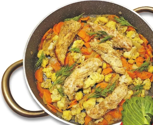 Ziedkāposti un burkāni ar cāļa krūtiņas fileju
