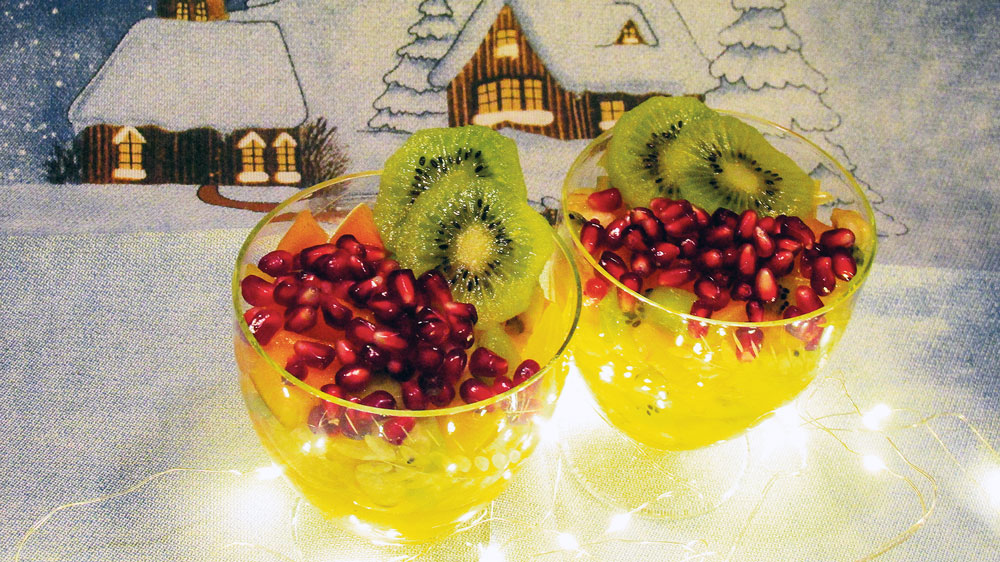 Visus augļus labi nomazgāju, nomizoju (apelsīnu daiviņas atbrīvoju arī no plēvītēm) un sagriezu kubiņos. Bļodā tos kopā viegli apjaucu un izliku stikla glāzēs. Samaisīju šķidru medu ar citronu sulu un pārlēju augļiem. Visu vēl pārkaisīju ar granātābola sēkliņām un varēju likt galdā.