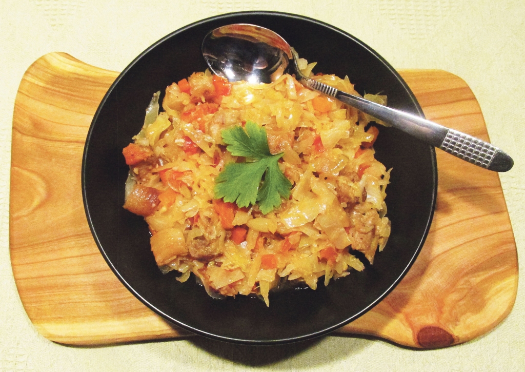 Burkānus un sīpolus sagriezu smalkos kubiņos. Speķīti sagriezu gabaliņos un karstā pannā sacepu tā, lai iztek tauciņi. Tad pievienoju burkānus un cepu līdz pusgatavībai. Pēc tam liku klāt arī sīpolus un spiedē sasmalcinātus ķiplokus. Kad pannas saturs bija pacepies, pārliku to katlā un piemaisīju nospiestus skābētos kāpostus. Uzliku katlam vāku un sautēju visu apmēram desmit minūtes. Nu pievienoju arī sasmalcinātus svaigos kāpostus un sautēju vēl 10 – 15 minūtes. Pa to laiku pannā apcepu lieso cūkgaļu (man gan bija vairāk speķa un mazliet mazāk kakla karbonādes, taču kāpostiem jau taukvielas neskāde – tie kļūst vēl gardāki). Piekaisīju sāli un piparus un pārliku gaļu katlā pie kāpostiem. Piemaisīju vēl arī cukuru, sāli pēc garšas un sagrieztus tomātus. Visu zem vāka sautēju apmēram stundu. Ne par skābiem, ne par saldiem. Bija tā darba vērts!
