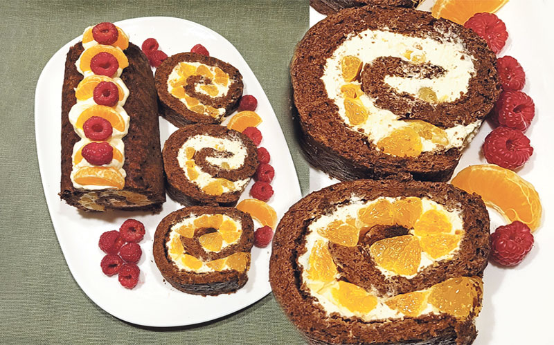 Mandarīnus nomizoju un sadalīju daiviņās. Saldo krējumu saputoju ar pūdercukuru un vaniļas cukuru. Putojot, pēc izvēles, vēl varam pievienot arī saldā krējuma biezinātāju – piekaisīju apmēram pusi mazās paciņas. Pieputoju klāt arī krēmsieru un ar pagatavoto viendabīgo balto masu, nedaudz no tās atstājot kūkas rotāšanai, pārsmērēju biskvītu. Visu bagātīgi pārliku ar mandarīnu daiviņām un uzmanīgi satinu ruletē. To ievietoju ledusskapī sastingšanai, pēc tam greznoju ar krēmu, mandarīnu daiviņām un svaigām avenēm. Gardi gan!