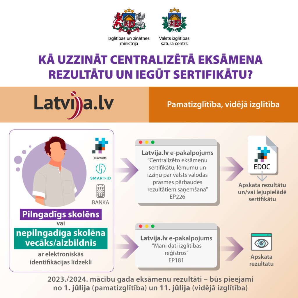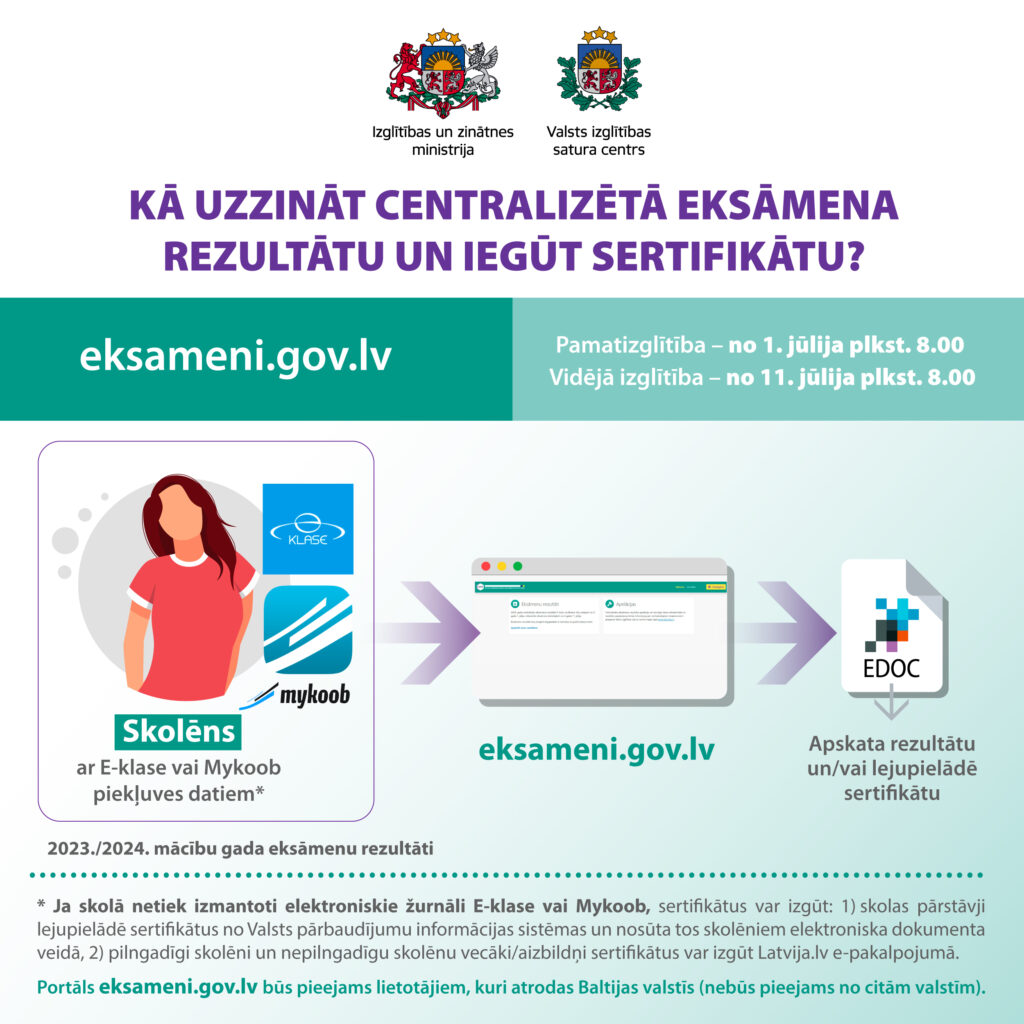 Skolēni pēc attiecīgā eksāmenu rezultātu paziņošanas datuma (pamatizglītībā – jau no 1. jūlija plkst. 8.00, vispārējā vidējā izglītībā – no 11. jūlija plkst. 8.00), izmantojot savus “E-klases” vai “Mykoob” piekļuves datus, varēs pieslēgties portālam “eksameni.gov.lv”, redzēt savus centralizēto eksāmenu rezultātus, kā arī izgūt nokārtoto centralizēto eksāmenu sertifikātus elektroniski parakstīta dokumenta formātā kā “edoc” datnes (sīkāka informācija par elektroniski parakstītiem dokumentiem). Izglītības un zinātnes ministrija atgādina, ka centralizēto eksāmenu sertifikātu oriģināli ir derīgi tikai kā elektroniski dokumenti un tos nav nepieciešams izdrukāt.