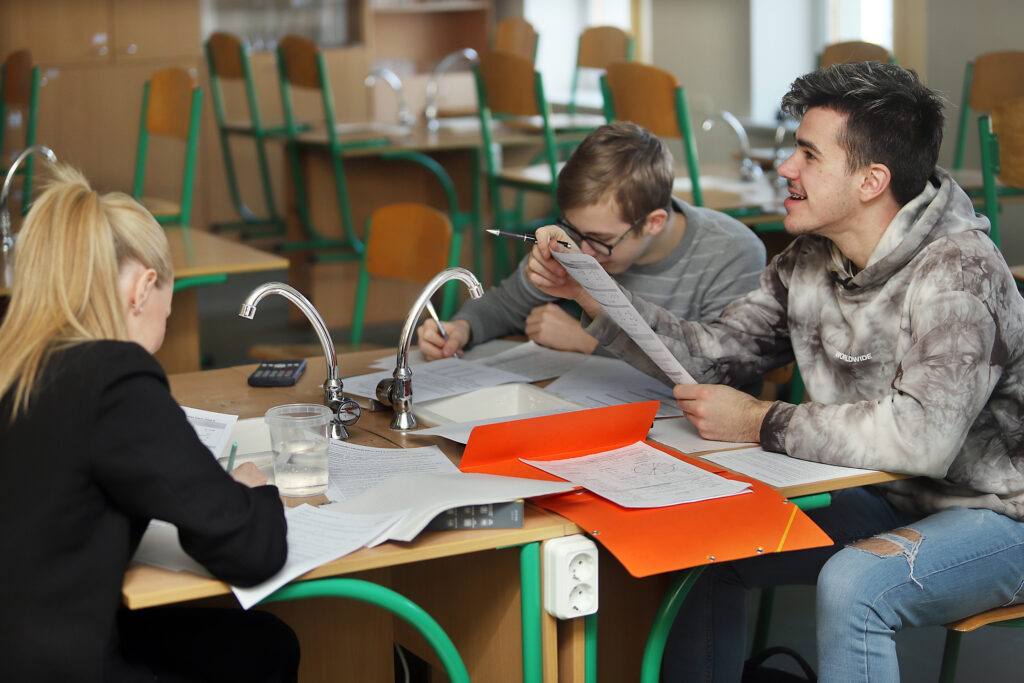 GULBENES NOVADA VIDUSSKOLAS 12.KLASES KOMANDA, kuras sastāvā Intars Ilgsalietis, Edžus Bleikšs un Leonia Ļutova apliecina savas zināšanas fizikas komandu olimpiādē. FOTO: GATIS BOGDANOVS