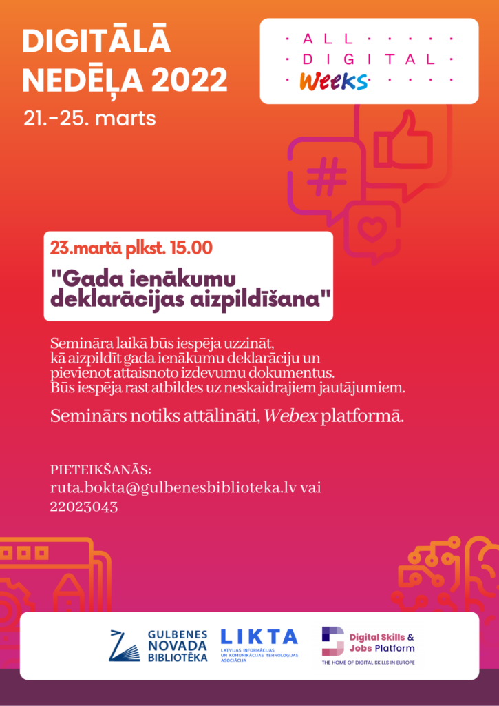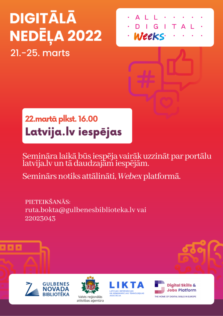 No 21. līdz 25.martam Latvijā noritēs Digitālā nedēļa. “Gulbenes novada bibliotēkā ir iespēja pieteikties uz attālinātiem semināriem un nodarbību digitālās nedēļas ietvaros,” aicina Reģionālā mācību centra vadītāja Rūta Bokta.