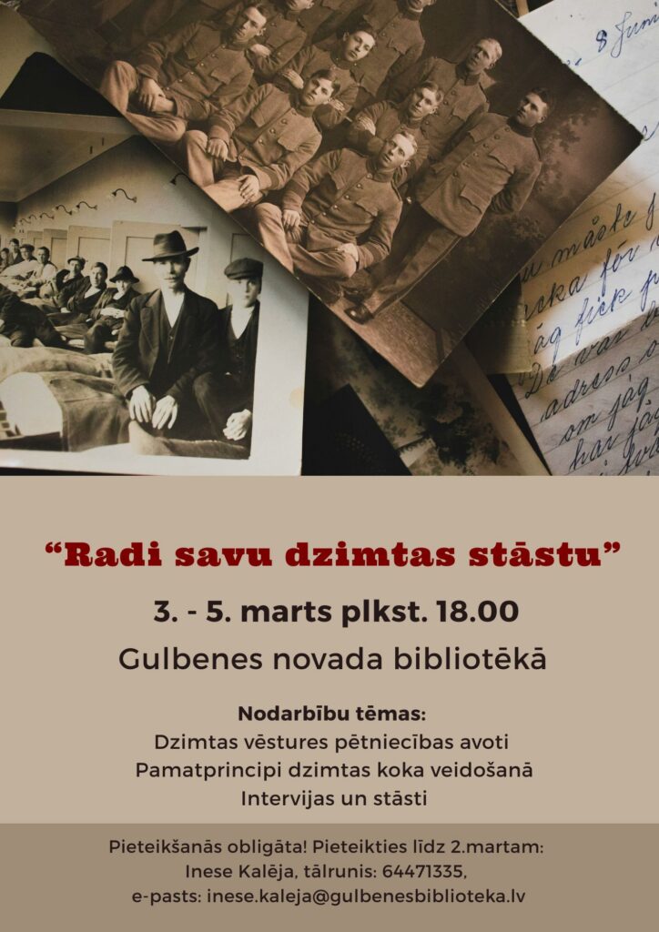Gulbenes novada bibliotēka aicina pieteikties bezmaksas mācībām ‘”Radi savu dzimtas stāstu!” Gulbenes novada bibliotēkā.