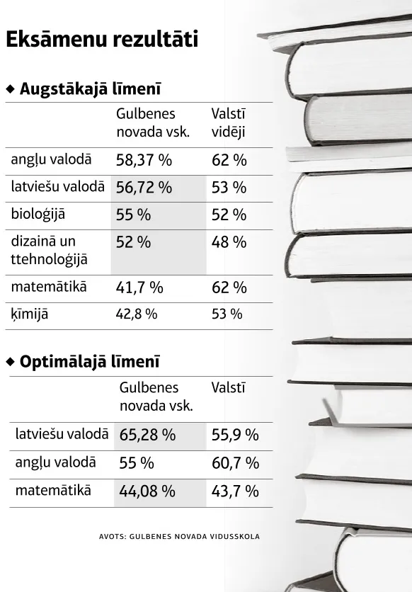 Gulbenes novada Izglītības pārvaldes izglītības darba speciāliste Inita Rozīte informē, ka kopumā skolēni kārtoja deviņus eksāmenus: latviešu valodā, angļu valodā un matemātikā pēc izvēles optimālajā vai augstākajā līmenī, kā arī bioloģijā, ķīmijā un dizainā un tehnoloģijās augstākajā līmenī.