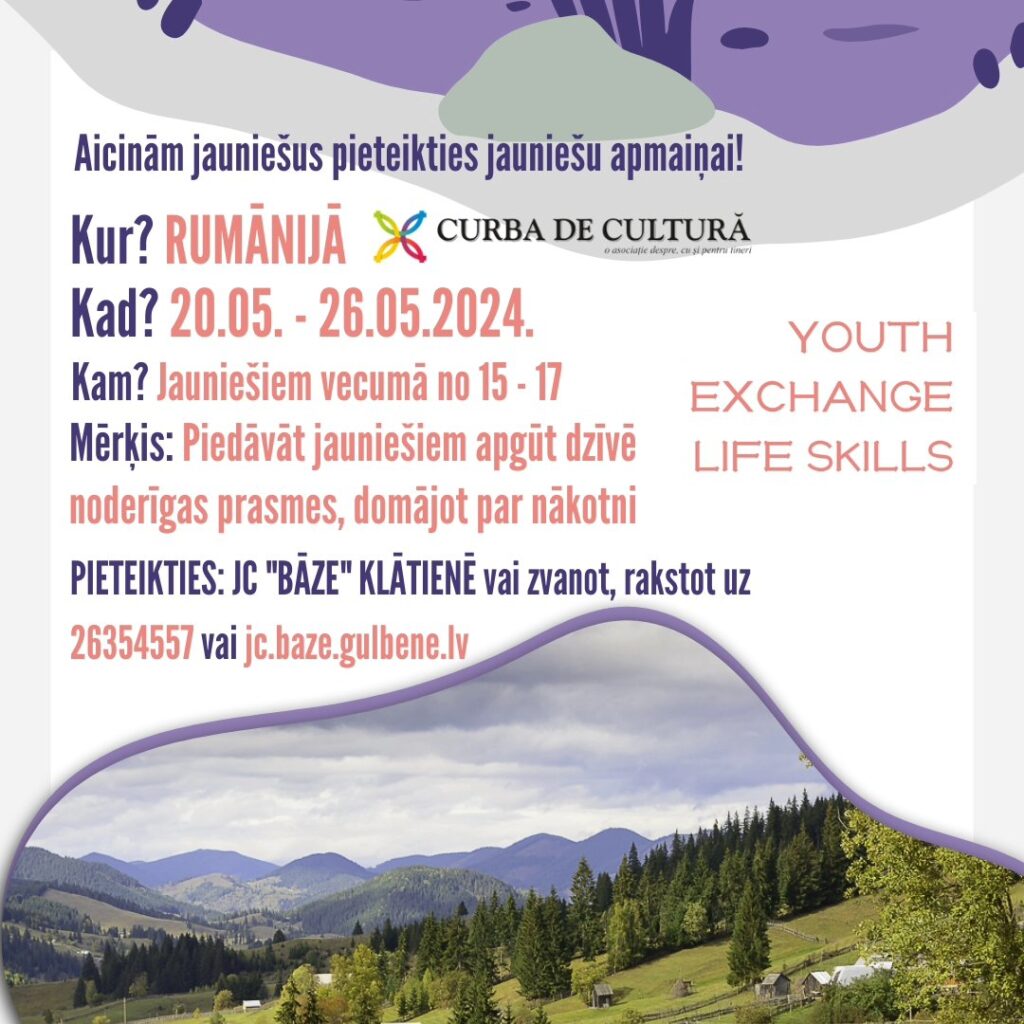 Gulbenes novada jauniešu centrs “Bāze” informē, ka no 20. līdz 26.maijam jauniešu apmaiņas programmā ir iespēja doties uz Rumāniju.