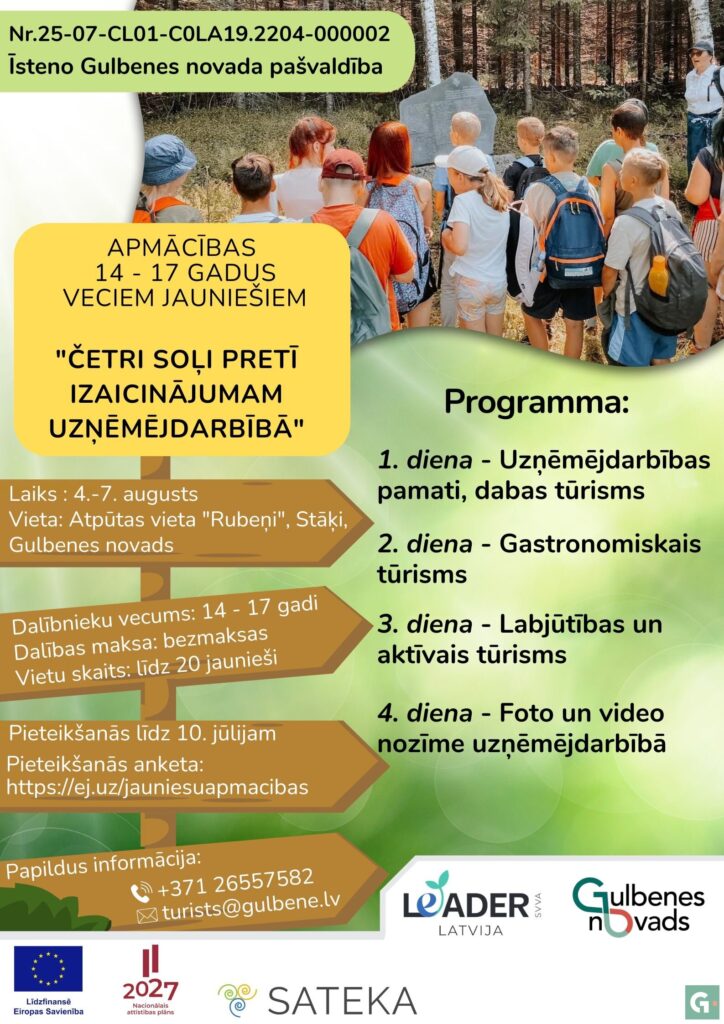 No 4. līdz 7.augustam atpūtas vietā “Rubeņi” Stradu pagasta Stāķos norisināsies apmācības “Četri soļi pretī izaicinājumam uzņēmējdarbībā” 14 līdz 17 gadus veciem jauniešiem.