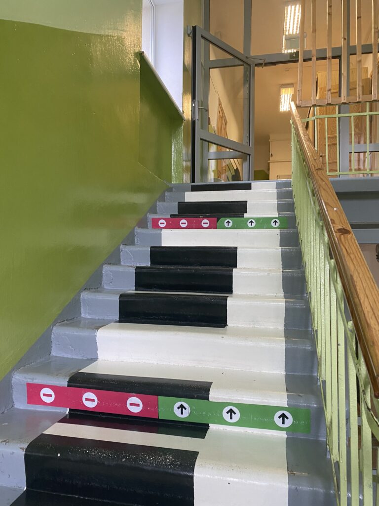 Projekta gaitā Gulbenes novada vidusskolas ēkā Skolas ielā 4.stāvā kāpnes uz mūzikas kabinetu ir nokrāsotas kā klavieru taustiņi. Foto: Inita Savicka.