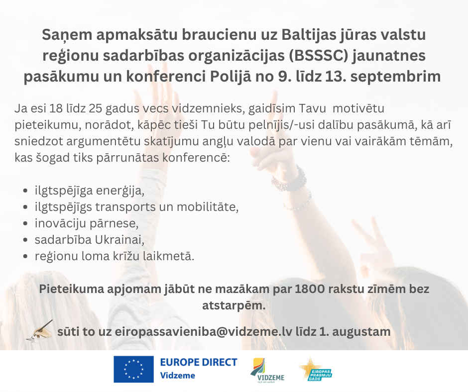 Vidzemes plānošanas reģions (VPR) jau vairākus gadus pārstāv Vidzemi Baltijas jūras valstu reģionu sadarbības organizācijā (BSSSC), kur tas ne tikai vada Inovāciju pārneses darba grupu, bet arī aktīvi līdzdarbojas jauniešu iesaistes jautājumos. VPR aicina reģiona jauniešus, vecumā no 18 līdz 25 gadiem, piedalīties BSSSC jauniešu pasākumā, kas notiks no 9. līdz 13. septembrim Polijā, Ščečinā.