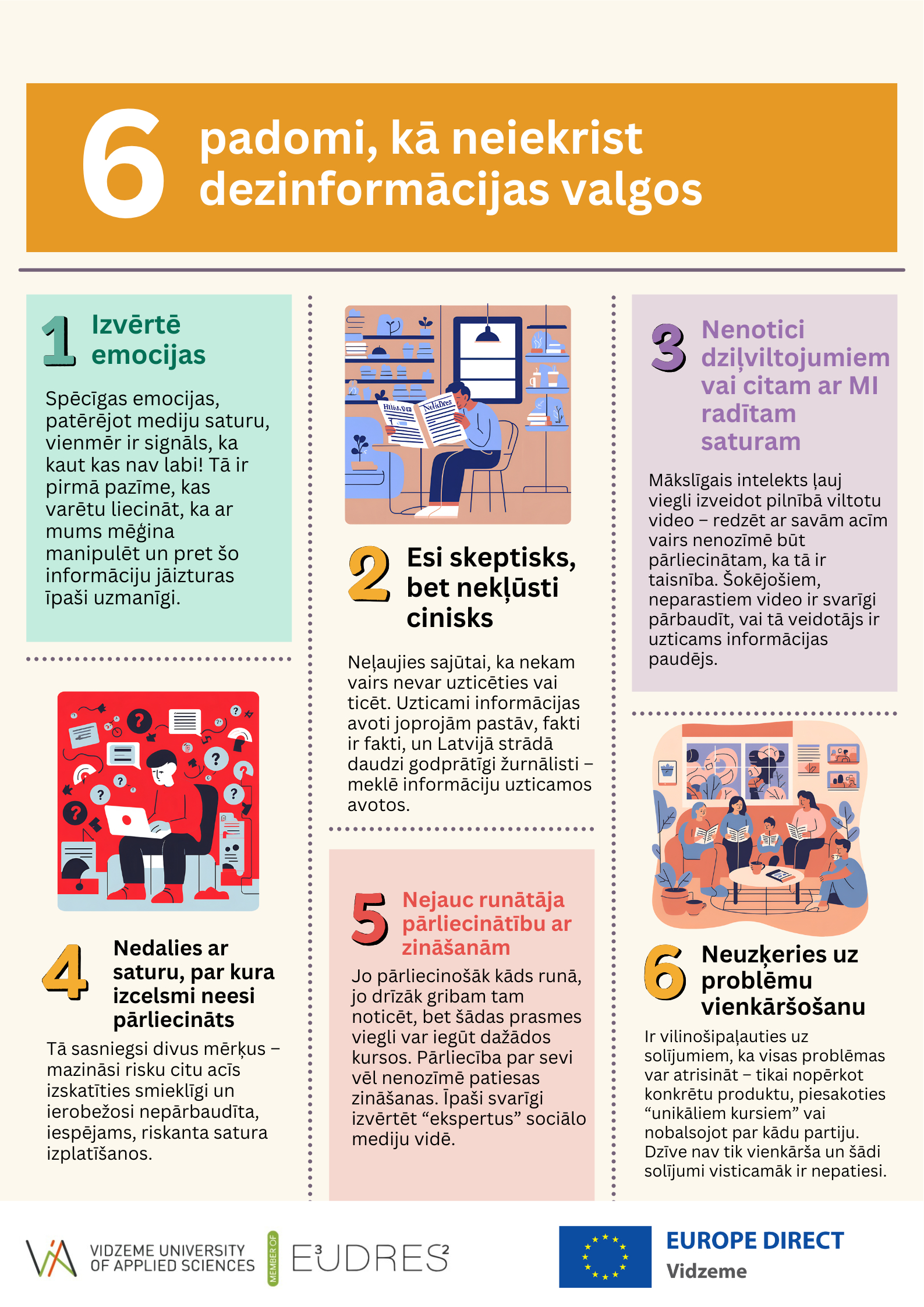Skaidrs, ka šobrīd, digitālo rīku iespējām attīstoties, arvien vieglāk ir radīt tādus materiālus, par kuru autentiskumu pārliecināties ir ļoti grūti. Tādēļ dezinformācijai var tikt izmantoti gan dziļviltojumi (deep fake) un mākslīgā intelekta ģenerētie attēli, gan dažādi automātiski profili, kas izplata informāciju. Tāpat var tikt ietekmēti sociālo mediju algoritmi, lai radītu iespaidu par informācijas uzticamību, un citas metodes. Labā ziņa – attīstās arī risinājumi, lai šo saturu atpazītu. Ja redzi materiālu, kas šķiet pārāk sensacionāls, to var pārbaudīt ar uzticamiem rīkiem, piemēram, “Google Reverse Image Search”, “TinEye” vai “InVID”.