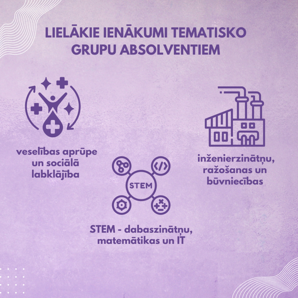 Dati rāda, ka, vērtējot visu piecu gadu rezultātus, absolvēto studiju tematisko grupu dalījumā 2022. monitoringa gadā augstākā nodarbinātība un nodarbinātība augstākās kvalifikācijas profesijās, pārsniedzot 90 %, ir izglītības jomas absolventiem. Augsti, tuvu 90 %, šie rādītāji ir arī veselības aprūpes un sociālās labklājības; dabaszinātņu, matemātikas, IT tematisko grupu absolventiem, savukārt viszemākā – humanitāro zinātņu un mākslas tematisko grupu absolventiem (80 % – 84 % nodarbinātība un 79 % – 81 % nodarbinātība augstākās kvalifikācijas profesijās). Vērtējot absolventu ienākumu pamattendences piecu gadu dinamikā, var novērot, ka jau pirmajā gadā pēc absolvēšanas augstākās izglītības absolventu vidējie aritmētiskie ienākumi ir par aptuveni 26 % augstāki nekā vidējā alga valstī, bet attiecīgi otrajā gadā par aptuveni 33 %, trešajā gadā – par 41 % augstāki, ceturtajā gadā – par 54 % un piektajā gadā par aptuveni 60 % augstāki.