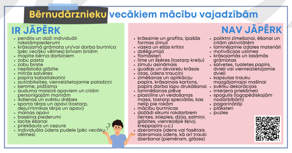 Konkrēts piederumu uzskaitījums ērtā un apkopotā veidā pieejams tiesībsarga mājaslapā. Jāņem vērā, ka bērnudārznieku un skolēnu vecākiem sniegtais skaidrojums ir atšķirīgs. Aicinām skolas un vecākus iepazīties ar sarakstos esošo informāciju.