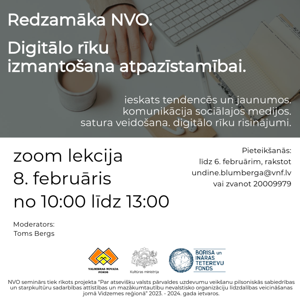 Valmieras novada fonds aicina nevalstiskās organizācijas (NVO) pieteikties bezmaksas tiešsaistes lekcijai “Redzamāka NVO. Digitālo rīku izmantošana atpazīstamībai”, kas notiks “Zoom” platformā 8.februārī no plkst. 10.00 līdz 13.00.