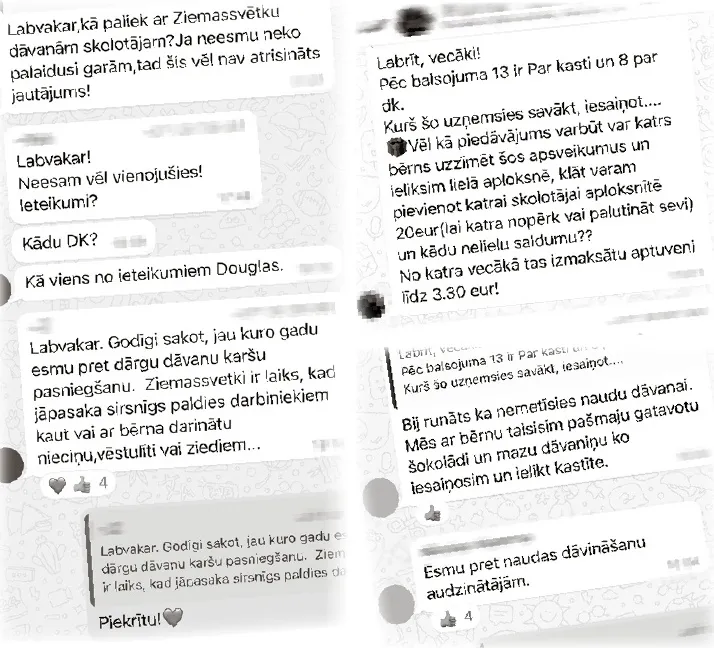 Tuvojas Ziemassvētki, un vecāku “WhatsApp” grupiņās aizvien vairāk, gluži kā Ziemassvētku virtenēs, izgaismojas ziņas ar mudinājumiem, ko dāvināt izglītības iestāžu skolotājiem. Daļa vecāku labprāt iesaistās pedagogu apdāvināšanā, citi klusē, bet ir arī vecāki, kuri kategoriski neatbalsta šādu iniciatīvu.