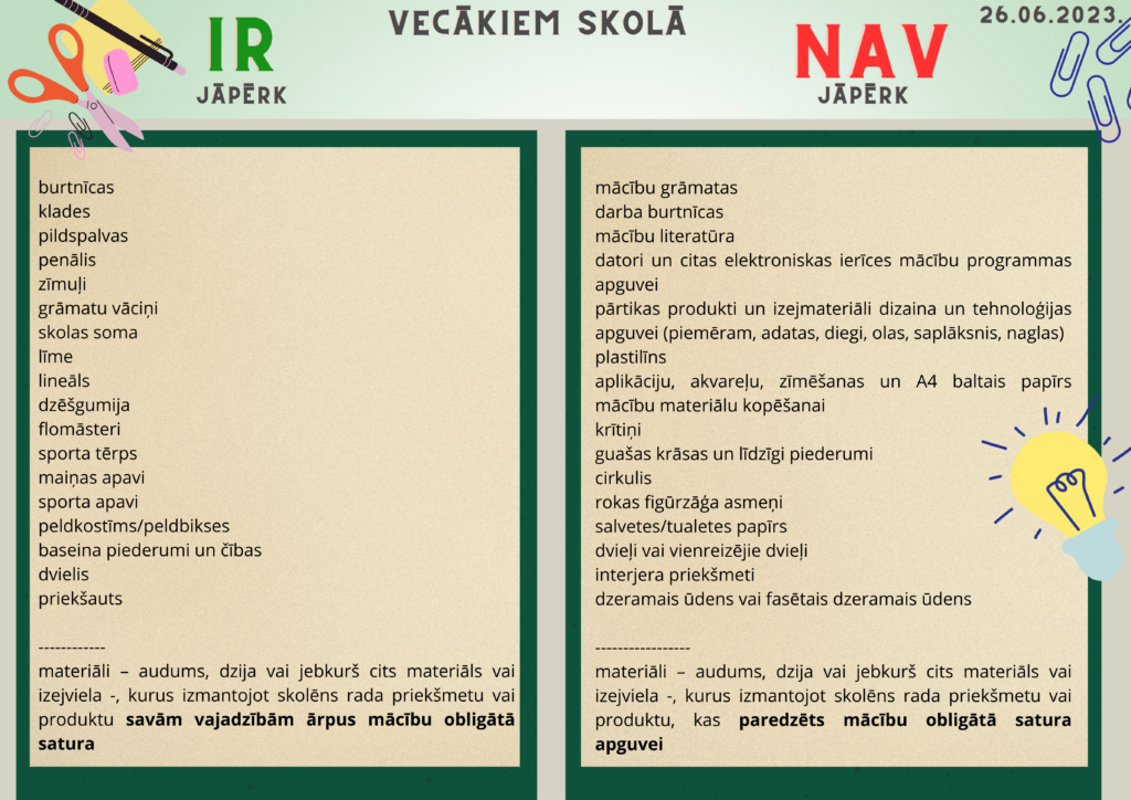 Izsmeļošs mācību piederumu uzskaitījums likumā nav iespējams un nav nepieciešams, jāievēro princips, ka materiāli izglītības obligātā satura apguvei nav jāpērk vecākiem. Prakse iekļaut individuālo mācību piederumu sarakstā mācību līdzekļus, kas jānodrošina skolai, neatbilst labas pārvaldības principam un nav pieļaujama. Tā ir uzskatāma par iestādes prettiesisku faktisko rīcību Administratīvā procesa likuma izpratnē. Apstrīdēšanas kārtība ir noteikta izglītības iestādes nolikumā.