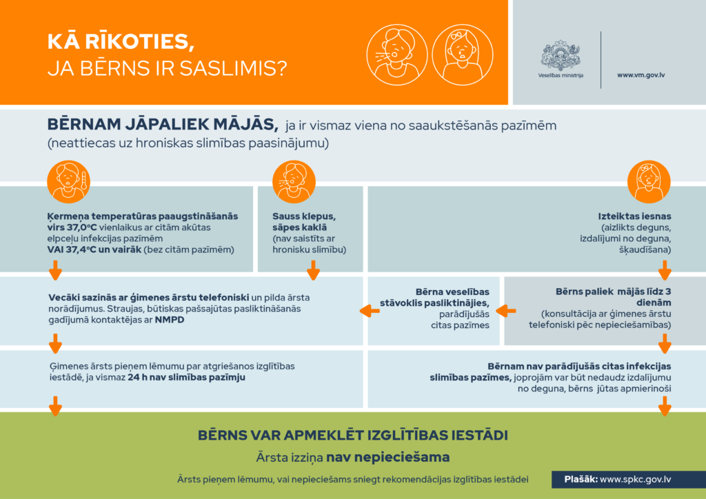 Līdz ar mācību gada sākumu un rudens tuvošanos, aktivizējas vīrusi un palielinās akūtu augšējo elpceļu infekciju slimību izplatības riski izglītības iestādēs. Veselības ministrija, Slimību profilakses un kontroles centrs (SPKC) un ārsti ir aktualizējuši ieteikumus un rīcības algoritmu vecākiem, kā arī izglītības iestādēm bērnu saaukstēšanās simptomu gadījumā.